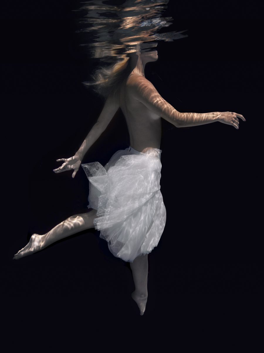 Adéntrate en un universo donde la luz y la sombra se entrelazan en un baile silencioso. Esta fotografía captura la esencia de una sirena envuelta en una falda blanca, destacando su figura etérea contra un fondo negro profundo, evocando misterio, pureza y la fuerza del alma marina.