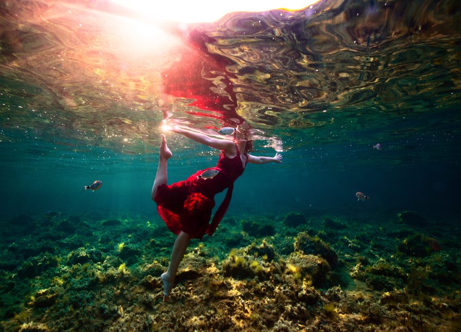 Cada detalle de esta fotografía resalta la belleza del movimiento suspendido, la ligereza y la pasión que emana del color vibrante de su vestido y la serenidad del entorno acuático.