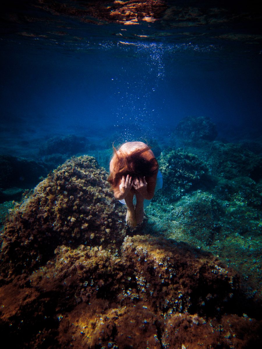 Adéntrate en un instante suspendido donde el tiempo parece detenerse y el agua se transforma en un espacio de profundidad y reflexión. Esta fotografía captura a una mujer inmóvil bajo el agua, encogida y contenida, evocando la sensación de preocupación y el peso invisible que sostiene en silencio.
