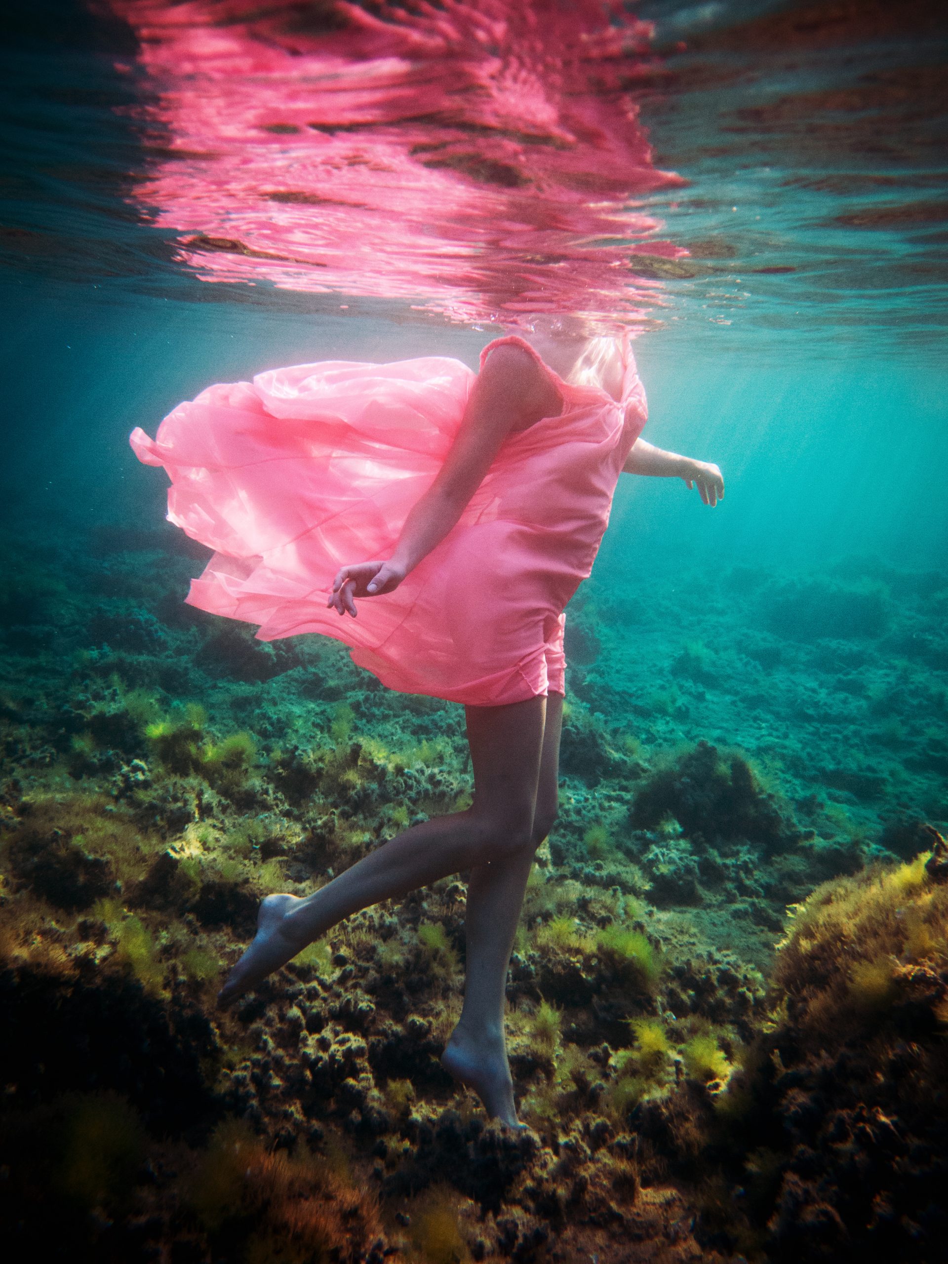 Adéntrate en un mundo donde el agua se convierte en un escenario mágico y el tiempo parece ralentizarse. Esta fotografía captura a una mujer que camina bajo el agua con un vestido vaporoso que flota a su alrededor, evocando la gracia y el misterio de una sirena en movimiento.